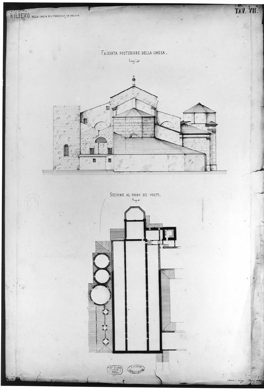 Rilievo della chiesa di San Francesco a Brescia: fronte absidale e pianta delle volte. Realizzato su carta pesante. Nella metà superiore del foglio vista della parte absidale che si sviluppa in più corpi architettonici di diverso livello e tipo. Metà inferiore, sezione e pianta delle volte di copertura.