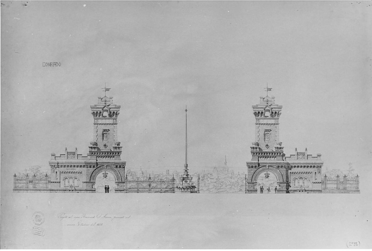 Progetto di barriera daziaria per Porta Tenaglia. Realizzato su carta pesante. Prospetto a china di due edifici simmetrici raccordati da una cancellata (interrotta a destra). Al centro: fontana su base poligonale con vasca circolare a cannelle, corpo centrale cubico con vasche su colonne agli angoli, serie di elementi con decorazioni zoomorfe e asta metallica terminale. Gli edifici, di architettura neomedievale, sono composti di un elemento a torre con base porticata (all'interno gruppi di figure) e di un corpo basso con coronamento a profilo spezzato. Sullo sfondo, oltre una cortina alberata, veduta urbana a china e matita da cui emergeil profilo a guhlie del Duomo di Milano.