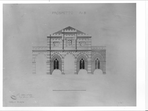 - NOTIZIE STORICO CRITICHE Il disegno fa parte di una serie di tavole di Giovanni Faini realizzate in occasione del concorso di Fondazione privata Vittadini pubblicato il 10-11-1871 e relativo ad un progetto di barriera da erigersi a Milano all'"ingresso della nuova Porta alla stazioen di Vigevano" Il progetto contrassegnato dall'epigrafe "Carlo Porta" è stato premiato dal Consiglio Accademico nel 1872 poichè alquanto deficiente dal lato decorativo, soddisfa però in modo lodevole a tutte le besigenze del servizio, pur mantenendosi entro i limiti di propporzioni modeste e attuabili"