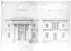 Prospetti allineati orizzontalmente di edificio a 2 piani su basamento bugnato, con coronamento ad acroteri e palmette e copertura a tetto. A sinistra facciata principale con avancorpo porticato di ordine ionico gigante (2 colonne scanalate centrali inquadrano un portone sormontato da grata) preceduto da scalinata. Le ali laterali inquadrate da doppio ordine di lesene, presentano 2 finestre sovrapposte con vano trapezio. A destra: facciata verso la città tripartita da un doppio ordine di lesene separate da alta fascia marcapiano. Centralmente: portale con vano trapezio scanalato da loggia trifora con coppia di colonne (parzialmente scanalate e con capitello palmiforme) e parapetto a motivi geometrici. Ai lati finestre sovrapposte con vano trapezio. Ombreggiature a bistro e tratteggio. Indicazioni dimensionali alle estremità.