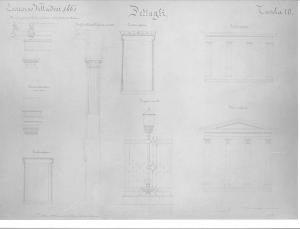 Dettagli a china e matita di barriera daziaria con didascalie a china. A sinistra: lesene sovrapposte con capitello decorato (motivi a plamette e floreali) separate da fascia intermedia a motivi geometrici e sormontate da trabeazione con protomi leonine e acroteri e palmette. Inferiormente: finestra con vano a trapezio. Al centro: profilo raffigurante superiormente colonna parzialmente scanalata con capitello planiforme, finestra con vano trapezio sormontata da cimasa; cancellata con lampione su basamento a zampe leonine. A destra: coppia di trifore sovrapposta.