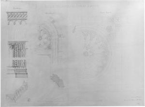 Dettagli a china e matita con ombreggiature a tratteggio. A sinistra superiormente dettagli del portale (prospetto e ianta) con aperture rettangolare sormontata da timpano a lunetta e sopra, cornice ad archi polilobati sormontata da fascia. Al centro, paricolare di porta (dettaglio parziale, prospetto e pianta) con aperture rettangolare sormontata da rosone, inserita in cornici concentriche ad arco. A destra particolare di rosone (vista parziale). Prospetto e parte di sezione.