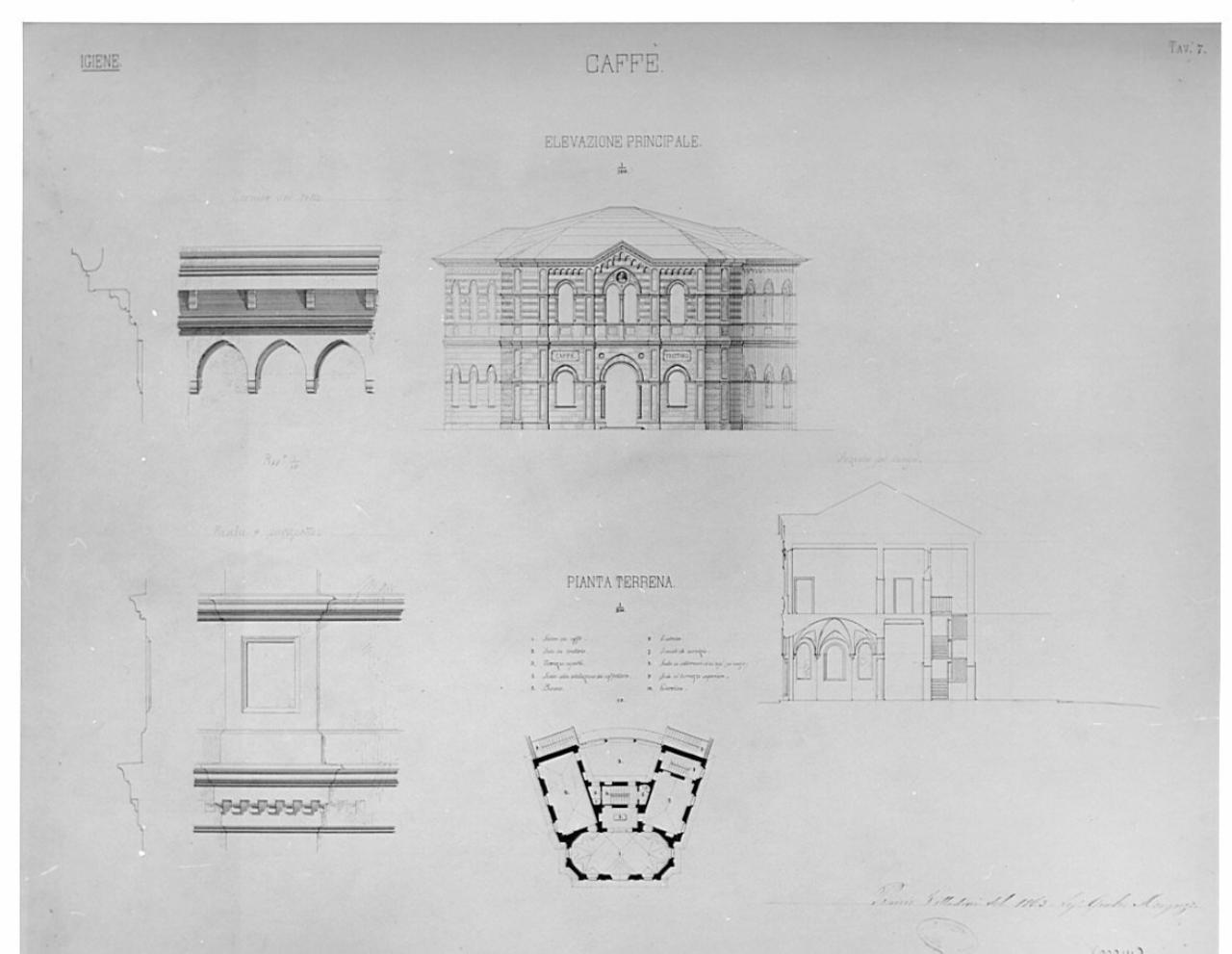 Bagni pubblici con annesse scuole di ginnastica e di scherma. architettura: bagni pubblici con annesse scuole di ginnastica e di scherma (piante, prospetti e sezioni del caffè)