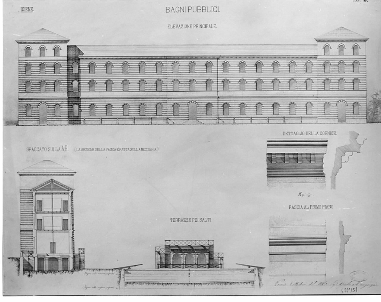 Bagni pubblici con annesse scuole di ginnastica e di scherma. architettura: bagni pubblici con annesse scuole di ginnastica e di scherma (prospetto, sezioni e particolari)