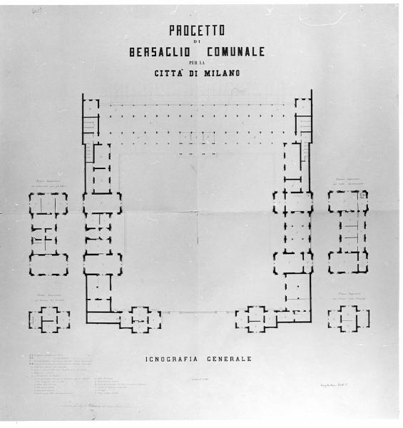 - NOTIZIE STORICO CRITICHE L'elaborato fa parte di una serie di tavole di Angelo Pavia realizzate in occasione del Concorso di Fondazione privata Vittadini bandito il 12 febbraio 1880 e relativi ad un bersaglio comunale per la città di Milano. Il progetto, contrassegnato dall'epigrafe "Guglielmo Tell" è stato premiato dal consiglio accademico in quanto superiore di merito a tutti gli altri per l'ottima disposizione della pianta pienamente soddisfacente alle richieste del programma, per la buona ossatura degli alzati sempre rispondente all'ufficio accui è destinata ciascuna parte dell'edificio; infine per essere il progetto praticamente costruibile essendo in ogni sua parte ragionevolmente disposto senza inutile dispendio in costruzioni esuberanti.