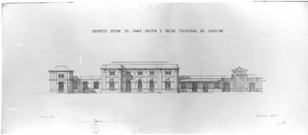Sezione trasversale. Al centro: prospetto di porticato su pilastrini con doppio ordine di copertura a falde, con avancorpo centrale a tre campate sormontate da bandiera. A destra e sinistra: sezioni non simmetriche di edifici (salone all'italiana con volta ribassata a sinistra; ambienti su due piani a ds). Ombreggiature a tratteggio parallelo o incrociato; sezioni a tratteggio incrociato.