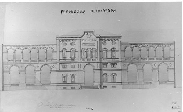 Progetto di una scuola elementare; l'edificio dovrebbe sorgere sull'area presentemente occupata dal fabbricato erariale ad uso di dogana di via Arena. architettura: edificio ad uso di scuola elementare (prospetto)