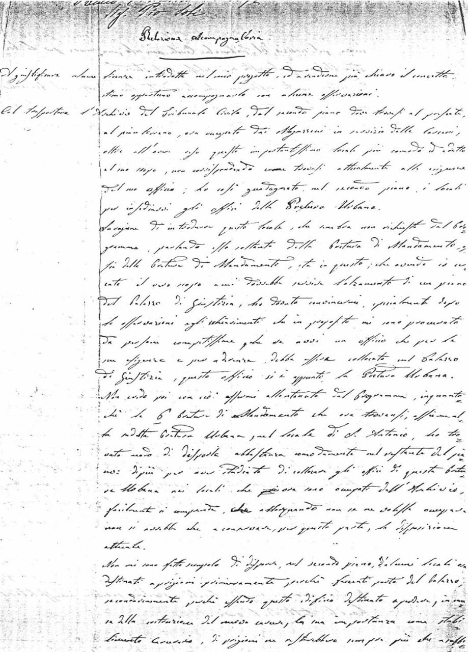 - NOTIZIE STORICO CRITICHE L'elaborato appartiene ad una serie di tavole di Pio Soli realizzate in occasione del Concorso Vittadini pubblicato il 10 novembre 1871 (ma riferibile all'anno 1869) relativo all'"alzamento del fabbricato denominato il Palazzo di Giustizia.. in modo da potervi insediare benanche gli uffici dellaPretura di mandamento" (Atti.., 1871, p. 55). Il progetto contrassegnato dall'epigrafe " Cesare Beccaria" è stato premiato dal Consiglio Accademico del 1872 "per lo studio della pianta pel concetto generale, pel carattere delle parti decorative" (Atti.., 1872, pp. 95-96)