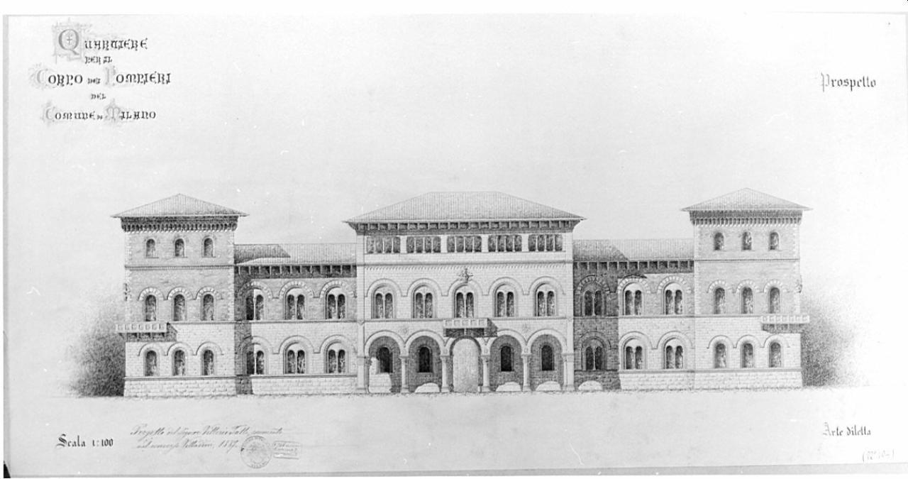 Prospetto di edificio stile neoromanico a china e con ombreggiature a tratteggio. Facciata a mattoni al p.t. e nel corpo centrale al p.t., al 1. p. e al p. sup. Edificio con corpo centrale ed estremità aggettanti a 3 pp. e corpi arretrati 2 pp. Corpo centrale con 5 arcate a p.t., porta centrale e lat. 2 finestre ad arco. Al p.t. Al 1° pianto 5 bifore entro entro archi ad anelli concentrici sormontate da ghiere. Al centro balcone sostenuto da mensole. Stemma in corrispondenza della chiave dell'arco. Sup. cornice a dente di sega a al p. sup. 5 quadrifore, cornice. Tetto a padiglione. Lat. corpi in aggetto a 3 pp., con basamento in pietra, 3 monofore ad arco al p.t. e al 1° p. Al p. sup. 3 finestre. Cornice sottogronda con beccatelli e tetto a padiglione. Sullo spigolo balcone decorato a riquadri.
