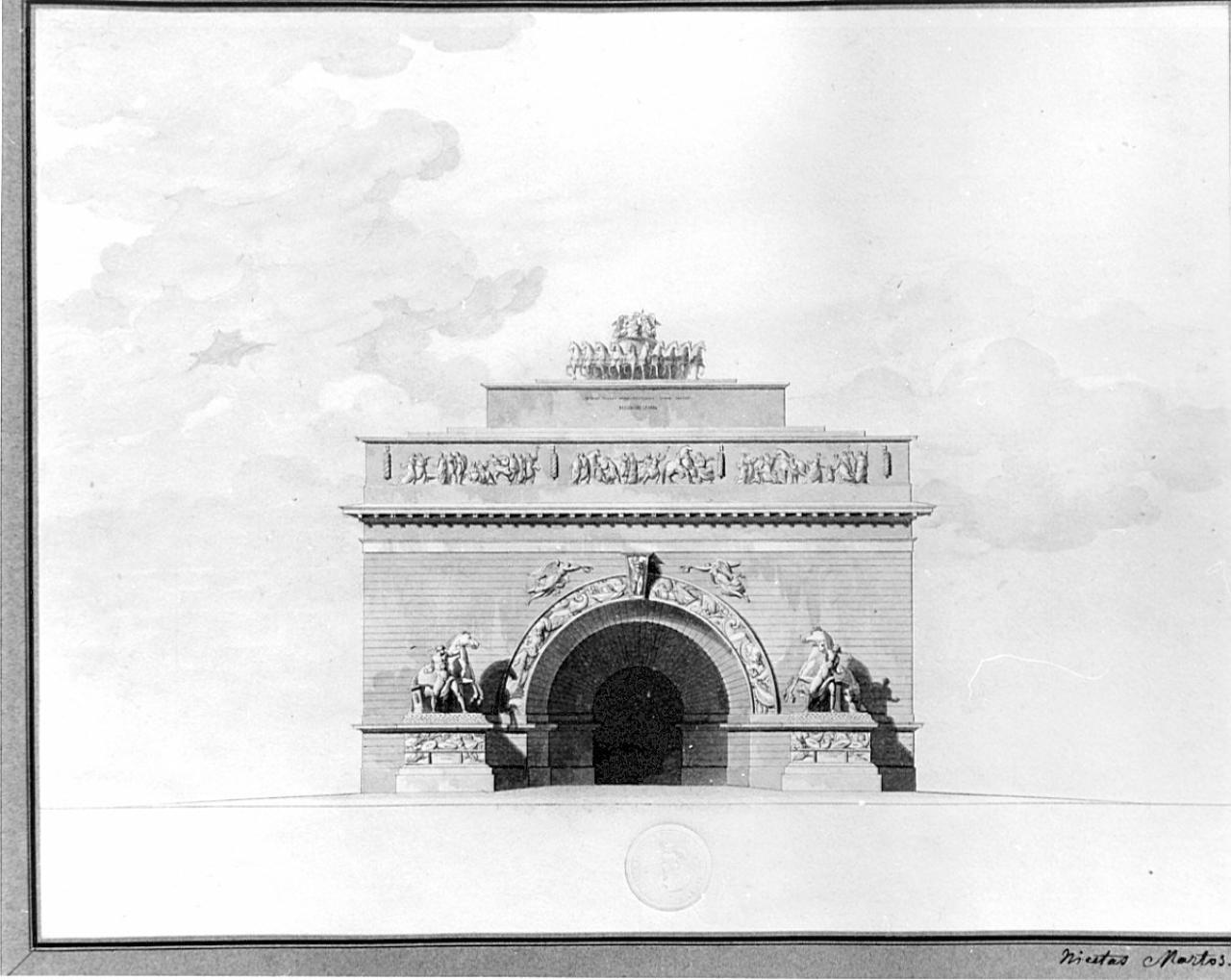 Prospetto di ingresso monumentale di edificio militare. Alzato di ingresso a china e bistro, su fondo chiaro con nubi acquarellate in grigio entro bordo cartaceo l'azzurro riportato. Corpo di fabbrica con l'arcata centrale provvista di ghiera con bassorilievi con chiave di volta raffigurante un guerriero con scudo, fiancheggiata da 2 gruppi scultorei su piedistalli ornati di trofei. Superiormente cornice dentellata e attico con 3 raffigurazioni eroiche intervallate da 4 fasci littori; al centro gruppo statuario con biga trainata da dieci cavalli.