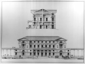Prospetto e sezione di un palazzo per un ricco signore. Prospetto e sezione trasversale di edificio a china, bistro e acquarello rosa, azzurro, verde, marrone in varie sfumature entro doppia marginatura a china. Inf.: prospetto di edificio a 2 piani oltre al mezzanino e attico inserito in camminamento porticato e terrazzato. AI centro atrio porticato con colonne giganti tuscaniche tra 2 corpi di fabbrica con muro a bugnato liscio con 3 finestre rettangolari, mezzanino liscio con finestrine e finestra termale intercalate da stemmi in ghirlande. Superiormente terrazza centrale, balaustra del camminamento tra due corpi con aperture centrali tripartite e sormontate da finestra termale. Sezione superiore trasversale con vista dei due ingressi e di quattro vani interni delle capriate e delle falde del tetto.