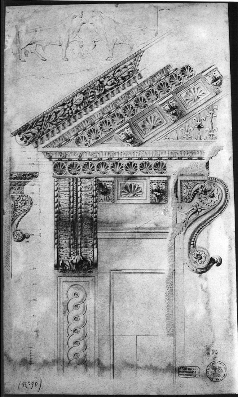 Disegno del rilievo di Palazzo Vitelleschi a matita chiaroscurato su 2 fogli di carta incollati. Prospetto, fianco e sezione della cornice del frontone retto da mensola, a matita con doppia fascia a foglie d'alloro e ovoli che regge fascia con palmette entro cerchi e gola dritta a motivi fitomorfi. Nel timpano i gigli fiorentini, le palmette, i fusi, le punte di diamante e, infine, una scozia con foglie di alloro e bacche: il listello a punte di diamante. A sinistra il fianco della mensola con rilievo quotato. In alto a sinistra lo schizzo di 2 torri frontali.