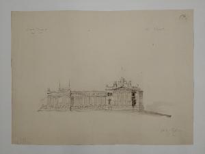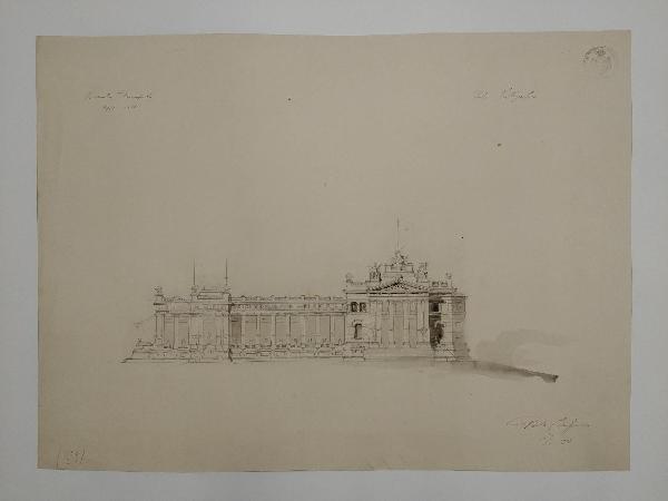 Progetto di edificio per sede di un club fotografico: facciata. Prospetto di palazzo a matita ed acquerello grigio, asimmetrico. La facciata è articolata; un corpo aggettante a destra con pronao e scalinate, mentre il rimanente da porticato sovrastato da balaustra. Il corpo a destra è a due piani ed è sormontato da balaustra e conclusa con il timpano con monumento e bandiera.