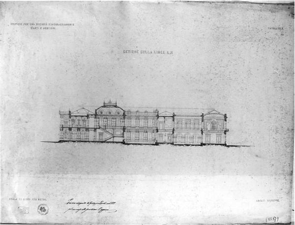 Edifico per una società d'incoraggiamento d'arti e mestieri. architettura: edificio per una società d'Incoraggiamento (sezione longitudinale)