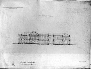 Progetto di edificio per una Società d'Incoraggiamento. Sezione longitudinale di edificio a matita ed acquerello seppia (muri sezionati). Due cortili interni. Alcune iscrizioni sono a inchiostro rosso.