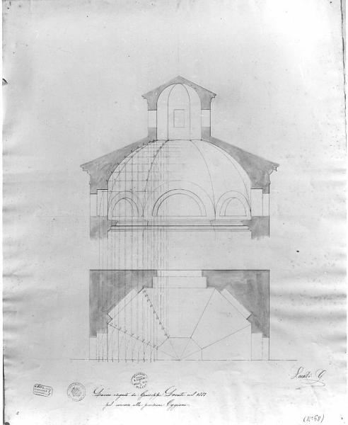 Progetto di edificio per una Società d'Incoraggiamento. Sezione e pianta di cupola con lanterna, a matita e acquerello seppia (sezione delle murature). Sulla mezza pianta (quadrato all'esterno e ottagonale all'interno) sono tracciate linee di costruzione della cupola riportate nella sezione verticale. Alcune iscrizioni sono a inchiostro rosso.