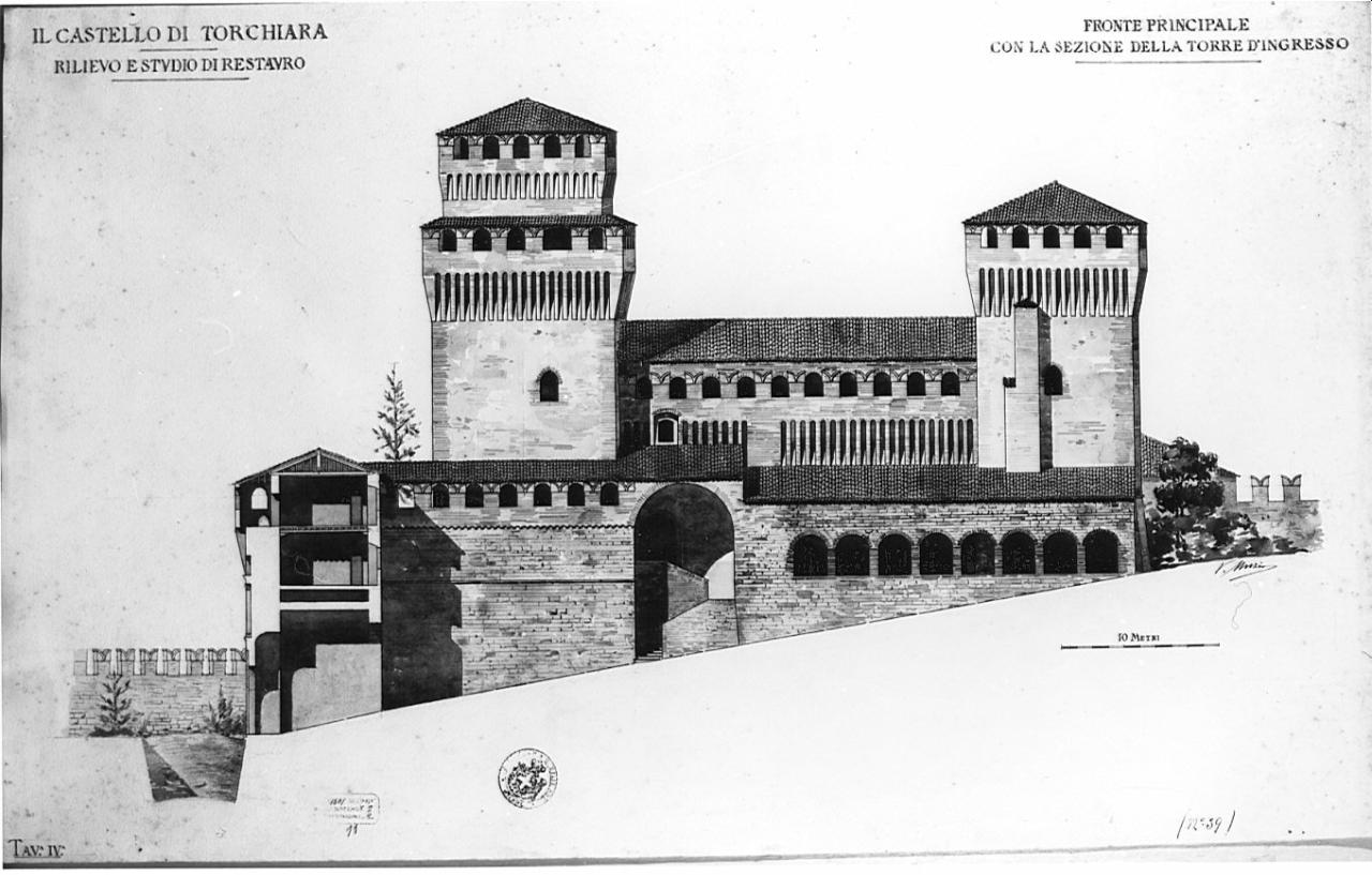 - NOTIZIE STORICO CRITICHE Il disegno fa parte di una serie di tavole (11 ) raccolte in 1 cartella dal titolo: "Saggio FINALE DELLA PENSIONE OGGIONI/: CASTELLO DI TORCHIARA/ RILIEVO E STUDIO DI RESTAURO" (firmato dall'autore; Timbri dell'Accademia). E' stato eseguito per il saggio finale della Pensione Oggioni (1891-94) nel 1893, e consegnato alla Commissione nel 1894. (Atti...,1891,p.153). Nel 1891 ottiene, oltre alla pensione, anche il diploma di Professore di disegno architettonico.
