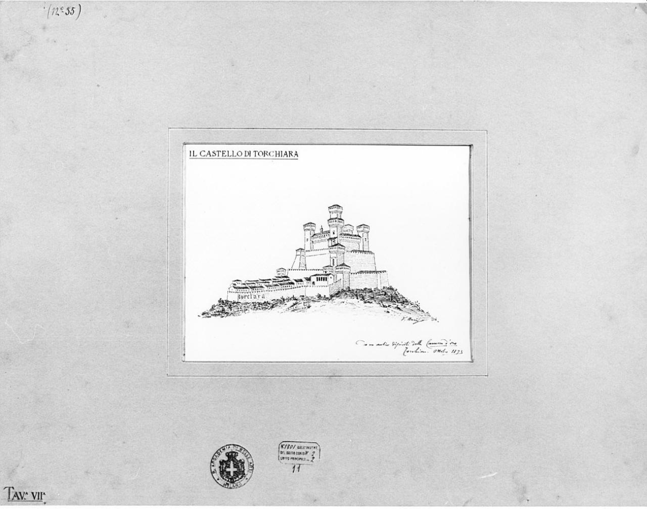 Sul recto: rilievo e studio di restauro del castello di Torchiara: disegno prospettico da dipinto. Prospettiva di castello a china nera (al tratto). Da sinistra, i borgo murato abitato, quindi il castello circondato da una prima cita muraria con porta d'accesso costituita da 2 torri merlate. Segue una seconda cinta con ingresso da un Torrione. Al centro il castello fortificato con le 4 torri laterali ed una di queste che si eleva sull'intero complesso. Il disegno è inserito in un passe-partout di cartoncino.