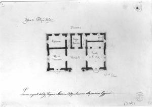 Sul recto: progetto di Ufficio di Polizia Urbana su carta pesante. Pianta di edificio con Ie murature colorate a matita nera: edificio a pianta rettangolare simmetrica con vestibolo quadrato d'accesso che distribuisce 4 locali di forma regolare.