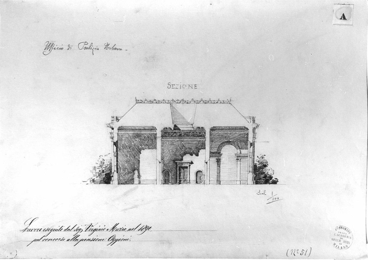 Sul recto: progetto di Ufficio di Polizia Urbana su carta pesante. Sezione a matita di edificio a 1 piano con tetto a falde. Sequenza di 3 locali con soffitto piano. Al centro porta rettangolare e lateralmente 2 porte ad arco. A destra arcata a tutto sesto.