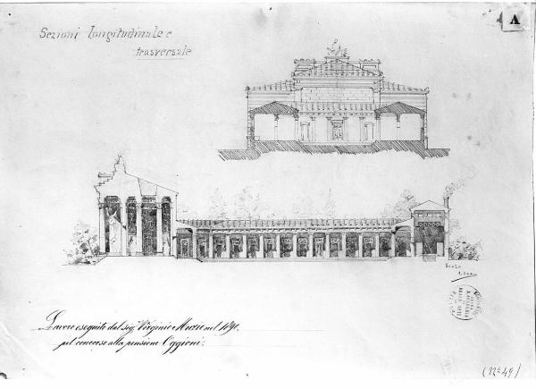 - NOTIZIE STORICO CRITICHE Il disegno fa parte di una serie di tavole presentate da Virginio Muzio al Concorso per la pensione Oggioni nel 1890. Virginio Muzio ottenne la pensione nel 1891 e sempre in quell'anno il diploma di professore di disegno. I saggi finali della pensione Oggioni (Rilievo e Studio del Castello di Torchiara) sono conservate nella cartella 11. (Gabinetto dei disegni dell'Accademia, Biblioteca dell'Accademia).