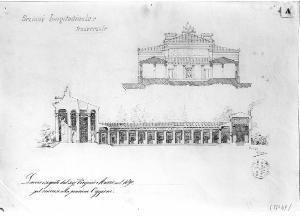 Sul recto: progetto di bagni pubblici. Sezioni longituclinali e trasversali di edificio a matita. In alto sezione di edificio a 1 piano con tetto a falde. Inf.sezione longitudinale di edificio con testata a doppia altezza e portico verso il cortile.