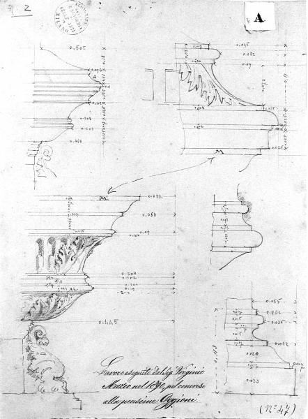 Sul recto: progetto di Cappella funeraria. Particolari architettonici quotati. In basso profili delle modanature con disegno parziale delle decorazioni. In basso a destra profilo di basamento. In alto a sinistra profili delle modanature, a destra profilo del basamento.