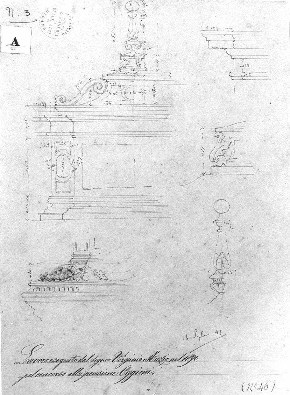 Sul recto: progetto di Cappella funeraria. Particolari architettonici quotati. In alto a destra prospetto parziale con quote di monumento; in basso a destra particolare del profilo del sarcofago; a destra particolari del monumento.