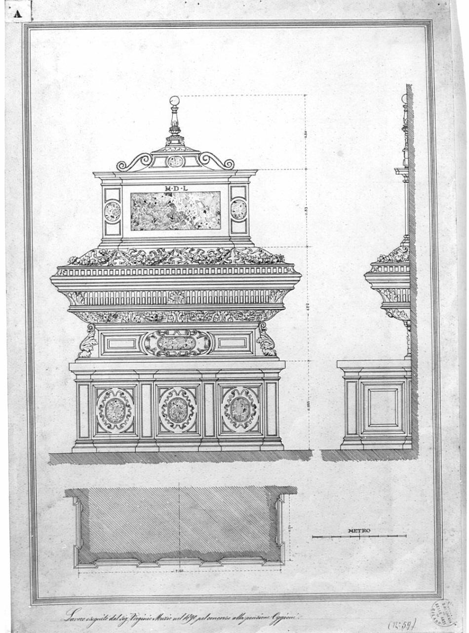 Sul recto: progetto di Cappella funeraria. Prospetto e sezioni di urna, a china su carta pesante. Campiture eseguite a tratteggio. In alto prospetto quotato del monumento, lato fianco e inferiore pianta quotata.