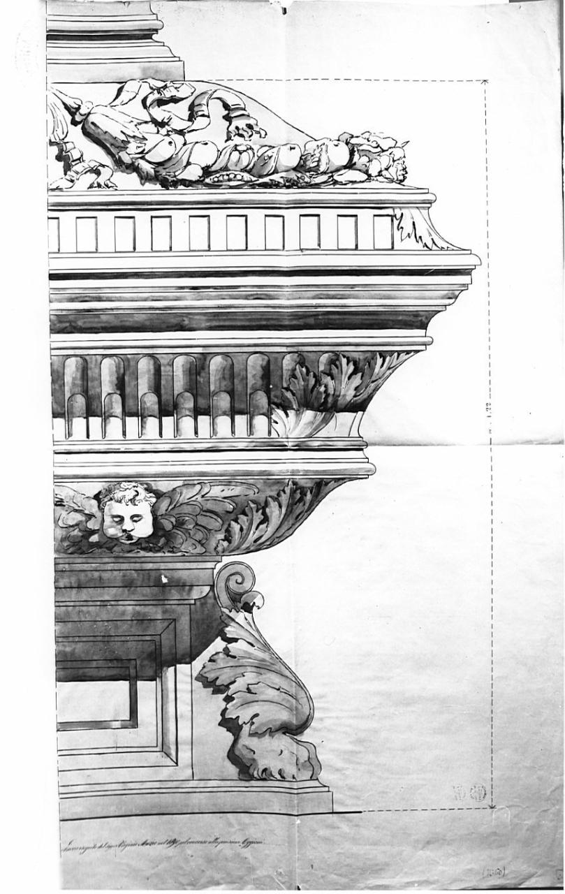 Sul recto: progetto di Cappella funeraria. Particolare architettonico a china con ombreggiature su carta leggera a grigia. Profilo di trabeazione.