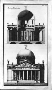 Progetto per Pantheon a china, bistro e acquerello rosa, verde e azzurro su fondo chiaro, entro linea di margine a china e bordo acquarellato. Inf.: prospetto di edificio a un piano con terrazza sup. e cupola preceduta da tamburo centrale. Vista del pronao esastilo con pilastri angolari. Sulla facciata 6 gruppi scultorei su piedistallo rappresentano allegorie, t:impano scolpito con scena simbolica con putti e sci collocati nel paesaggio romano. Mia terrazza superiore con balaustra sono collocate 2 statue maschili e 2 trionfi. La cupola semisferica che presenta due fregi sul tamburo e una corona superiore retta da acquile è sormontata da una vittoria alata. Superiormente: sezione dell'edificio, delle colonne interne a fusto liscio e capitello corinzio della sala più grande con vista delle aperture cieche della sala più piccola, vista del tamburo e della cupola semisferica superiore con putti reggi medaglioni.