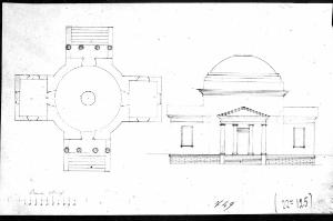 Pianta e alzato a china e matita su fondo chiaro.\nSinistra: pianta di edificiocio are con quattro avancorpi simmetrici di cui due pronai preceduti da gradinate. \nDs.: alzato di edificio con pronao centrale fornito di quattro colonne lisce con capitello ionico. Vista dei corpi di fabbrica laterale e della copertura a cupola con gradoni.