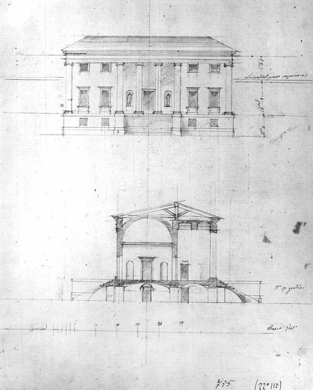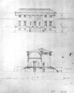 Pianta e edificio a matita su fondo chiaro. Pianta di edificio centrale preceduta da avancorpo con gradinata, vestibolo delimitato da due colonne, serie di vani lungo il perimetro a sala circolare al centro.