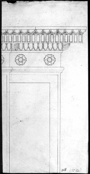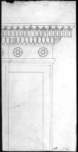 Alzato di modanatura a china su fondo chiaro. inferiormente: cornici di profili piatti. Sup.: decorazioni geometriche con fiori e ovoli ricordano il fregio e la trabeazione classica.