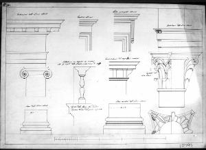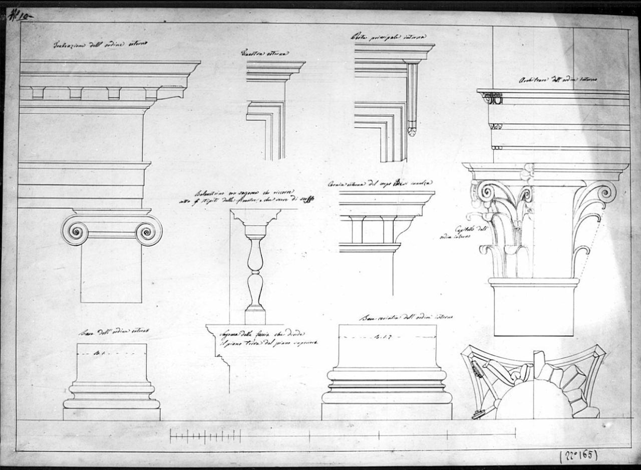 Serie: di 10 alzati, piante e sezioni d'ordine: classico a china e matita su fondo chiaro entro linea di margine a china. Scritte ad inchiostro color seppia accanto ai disegno. Sinistra: base a trabeazione conica. Centro: profilo modanato, alzato di balaustrino e modanature della finestra, base corinzia e modanature della porta. Destra: piante a trabeazione corinzia.