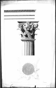Pianta, alzato e architrave di capitello corinzio a china, bistro su fondo chiaro entro linea di margine a china. Inferiormente: pianta del capitello su due diversi livelli di sezione. Superiormente: alzato del fusto, del capitello e dell'architrave.