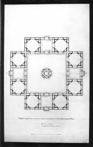 Progetto di Pantheon a china e acquerello rosa per le sezioni di muratura, su fondo chiaro, entro doppia linea di margine a china nera e bordo acquarellato verde. Pianta quadrangolare con quattro avancorpi rettangolari simmetrici intorno ad una corte quadrata con edificio centrale circolare fornito di quattro pronai preceduti da gradinate inserito in corte centrale quadrata con ingresso preceduto da gradinata affiancata da due sale ottagonali. Linea di sezione rossa.