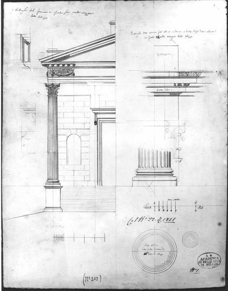 - NOTIZIE STORICO CRITICHE Il disegno è relativo ad una prova di conoscenza degli ordini architettonici (?). E' conservato nella cartella 12 che raccoglie numerose prove di concorso di Prima classe rifiutate dalla commissione esaminatrice, prove di ammissione alla pensione romana e alcuni progetti di Zanoja.