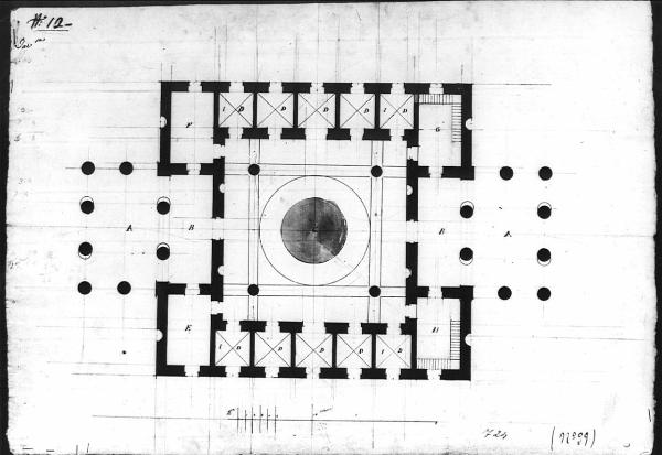 - NOTIZIE STORICO CRITICHE Il disegno fa parte di una serie di 10 tavole relative ad un progetto presentato come prova d'accesso alla pensione romana nel 1815 (?).\nE' conservato nella cartella 12 che raccoglie numerosi saggi di concorsi di I classe della scuola di architettura destinati ad essere restituiti agli allievi e progetti diversi.