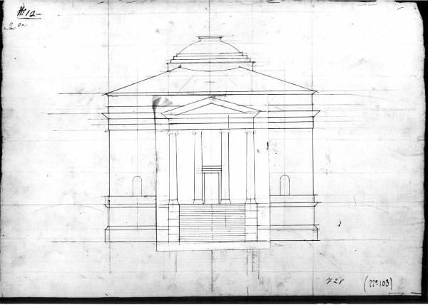 Prospetto di edifici a matita e china su fondo chiaro con disegno del pronao centrale incollato.\nEdificio centrale con pronao preceduto da gradinata centrale e zoccolo con quattro colonne con capitello ionico (a matita) timpano superiore; copertura a falde con cupola ribassata preceduta da gradoni