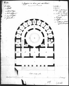 - NOTIZIE STORICO CRITICHE Il disegno fa parte di una serie di 6 tavole relative ad un progetto presentato come prova d'accesso alla pensione romana nel 1815 (?).\nE' conservato nella cartella 12 che raccoglie numerosi saggi di concorsi di I classe della scuola di architettura destinati ad essere restituiti agli allievi e progetti diversi.