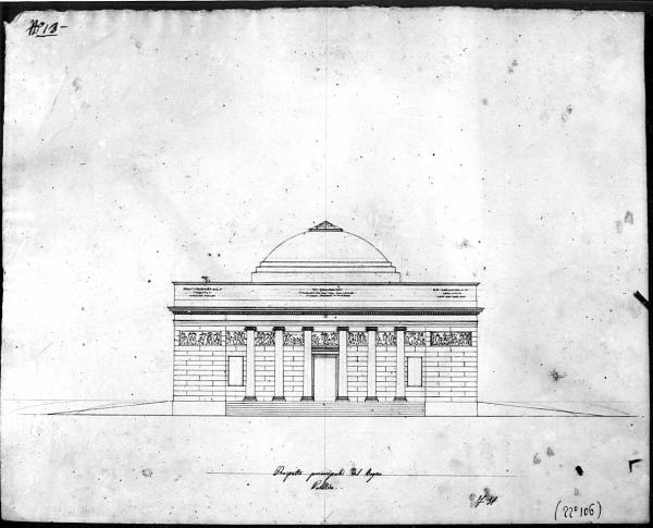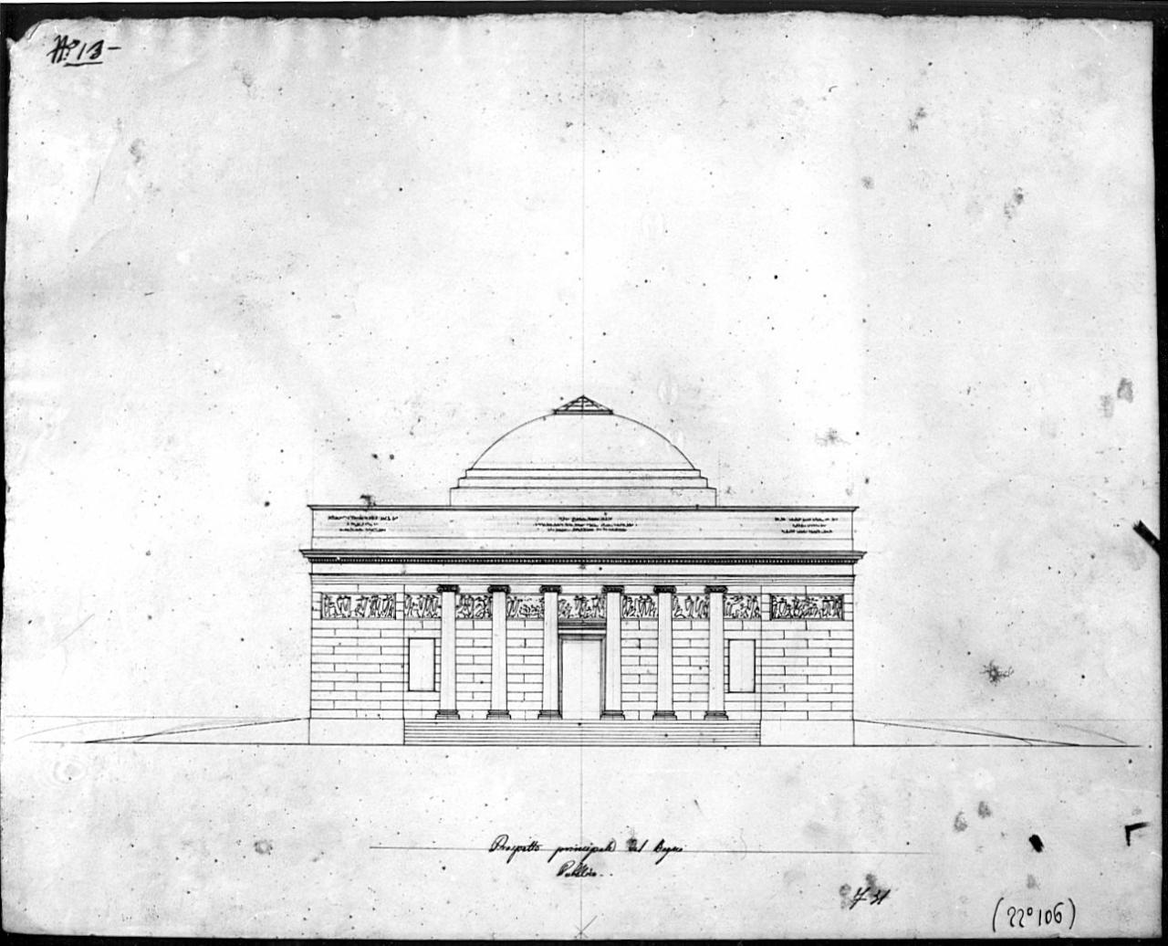 - NOTIZIE STORICO CRITICHE Il disegno fa parte di una serie di 6 tavole relative ad un progetto presentato come prova d'accesso alla pensione romana nel 1815 (?).\nE' conservato nella cartella 12 che raccoglie numerosi saggi di concorsi di I classe della scuola di architettura destinati ad essere restituiti agli allievi e progetti diversi.