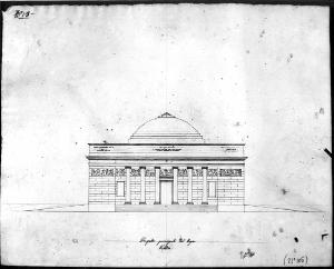 Prospetto di edificio adibito a bagno pubblico a china su fondo chiaro.\nEdificio quadrangolare con portico esastilo con capitello conico preceduto da gradinata, mura a bugnato liscio, fregio continuo sotto la cornice, attico superiore con iscrizioni e cupola centrale ribassata con gradoni.