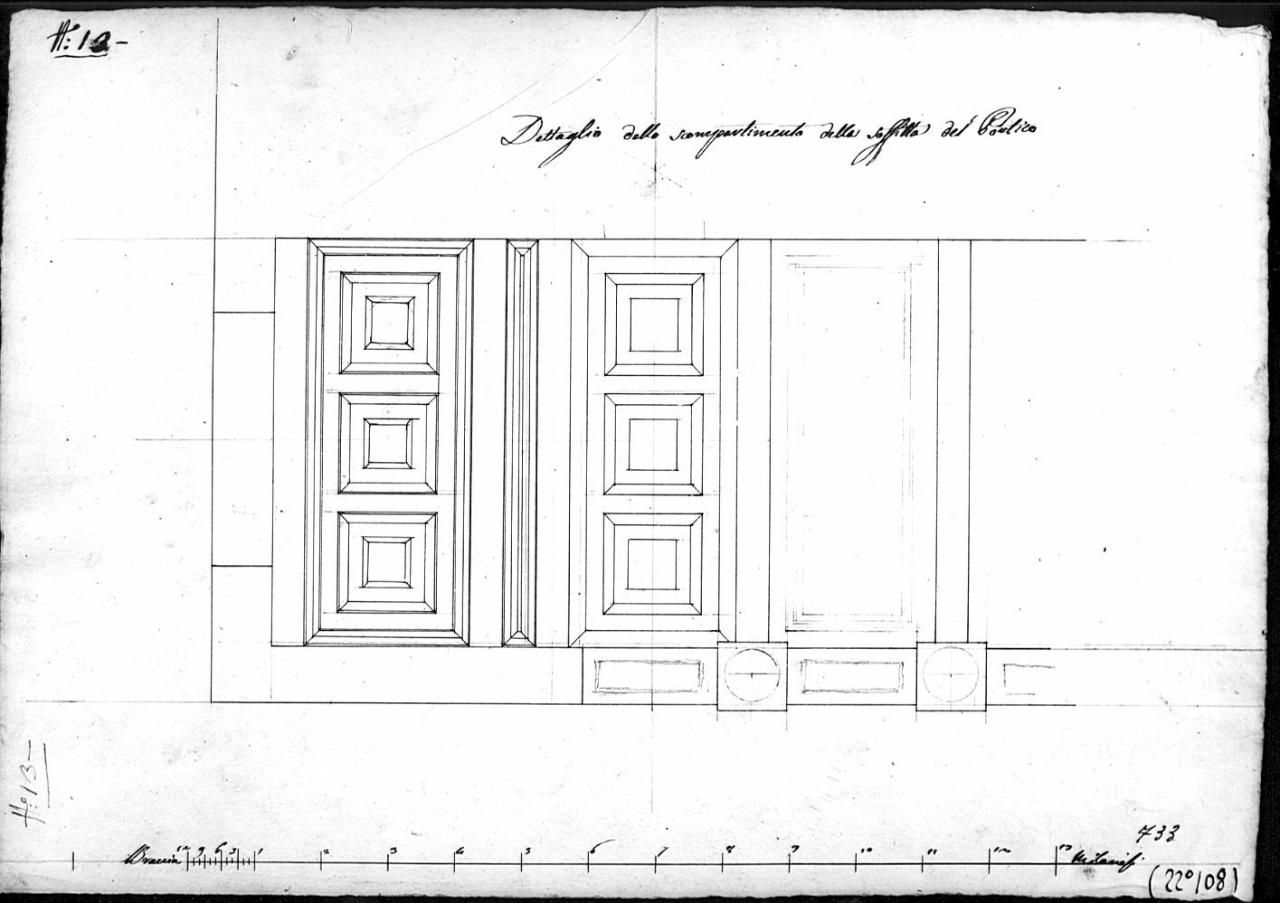Veduta dal basso verso l'alto del soffitto del portico a china e matita su fondo chiaro. Tre scomparti rettangolari con tre lacunari quadrati visibili le sezioni a matita delle cornici.
