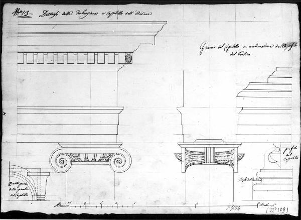 Alzati, piante e sezioni della trabeazione a china su fondo chiaro. Sinistra: sezione di un quarto di capitello ionico, alzato di trabeazione conica. Destra: fianco, base e profilo del capitello e delle modanature del soffitto del portico.
