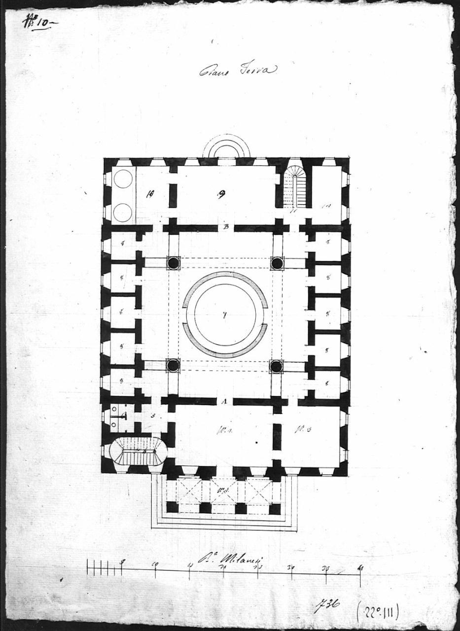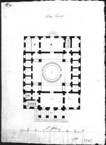 - NOTIZIE STORICO CRITICHE Il disegno fa parte di una serie di quattro tavole relative ad un progetto presentato come prova d'accesso alla pensione romana nel 1815.\nE' conservato nella cartella 12 che raccoglie numerosi saggi di concorsi di I classe della scuola di architettura destinati ad essere restituiti agli allievi.