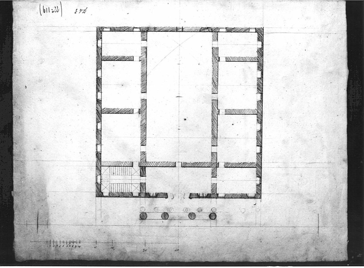 Pianta di edificio quadrato a matita su fondo chiaro con sezioni di muratura a tratteggio. Pianta quadrata, preceduta da pronao con grande sala rettangolare al centro e vani quadrangolari adiacenti al perimetro.
