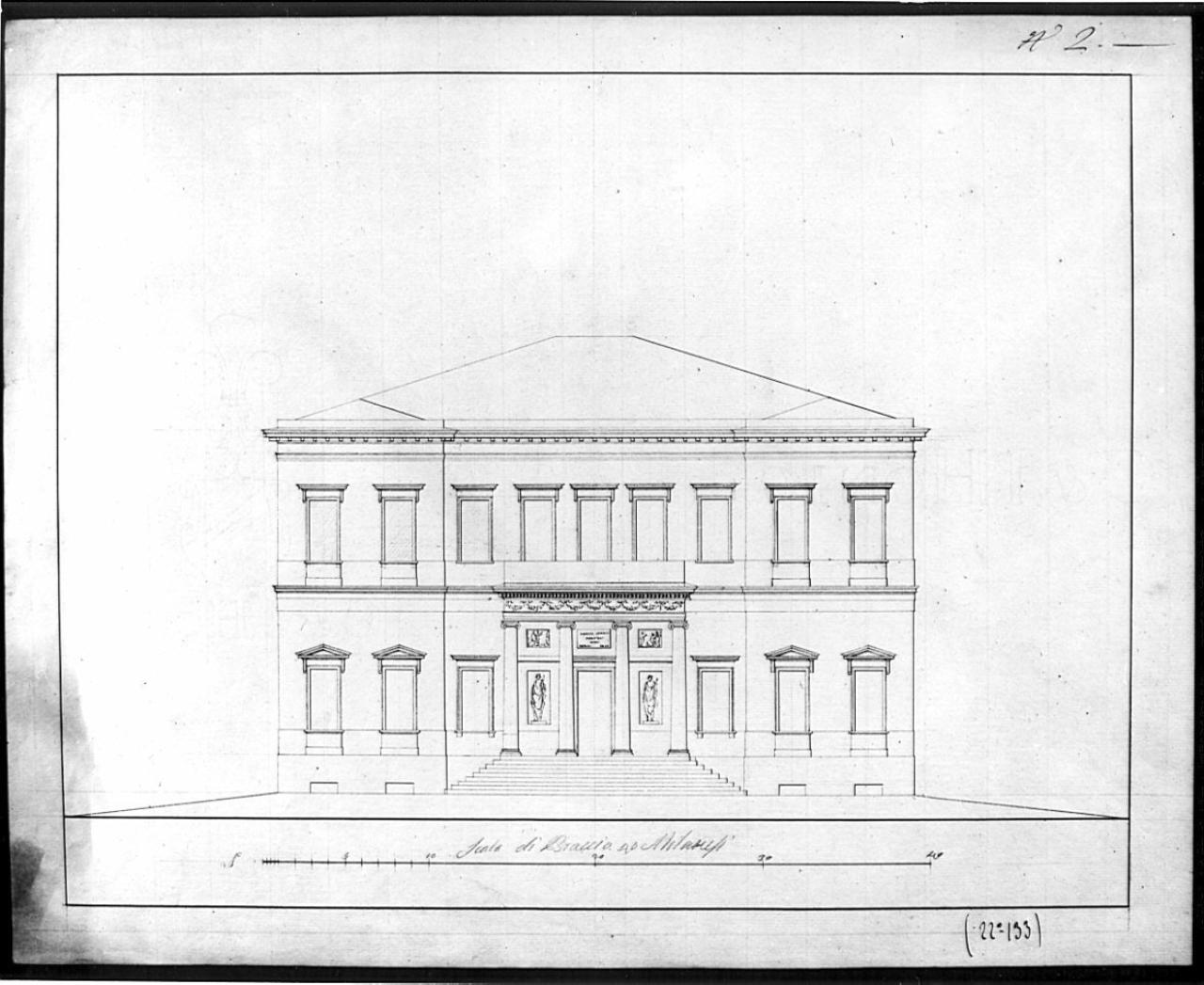 Prospetto di edificio a china e matita su fondo chiaro, entro linea di margine a china. Alzato di edificio simmetrico con ingresso centrale preceduto da gradinata e fornita di quattro colonne di ordine gigante con capitello conico, intervallate da due statue togate inferiormente, due bassorilievi superiormente. Serie di aperture modanate di forma rettangolare.
