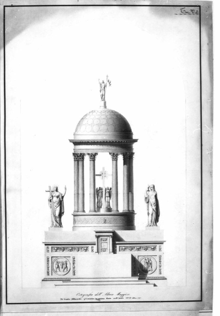 Prospetto di un Altare a china e bistro, su fondo acquarellato giallo e azzurro entro linea di margine a china sormontato da ciborio a foggia di tempio circolare (tholos) con colonne scanalate con capitello corinzio. Alla sommità della cupola una statua con "Cristo Trionfante". A fianco del Ciborio la Fede: a sinistra figura togata con la Croce, a destra il calice dell' Eucarestia. All' interno del ciborio angeli che sorreggono la Croce. Ai lati del tabernacolo due colonnine a capitello corinzio. Il basamento del ciborio, preceduto da tre gradini, è decorato con specchiature fitomorfe; a sinistra tondo con il torchio mistico. A destra tondo con due portatori di vaso. Foglio marginato.