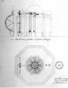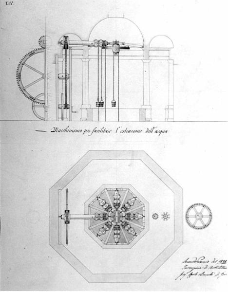 Pianta e prospetto di un congegno meccanico, a china, bistro, acquarello, con marginatura ocra chiaro. Inferiormente: pianta ottagonale del meccanismo con ruota, perno, ingranaggi. Superiormente: sezione dell'edificio in cui è collocato il meccanismo per l'estrazione dell'acqua tramite secchi azionati da carrucole. Marginato.